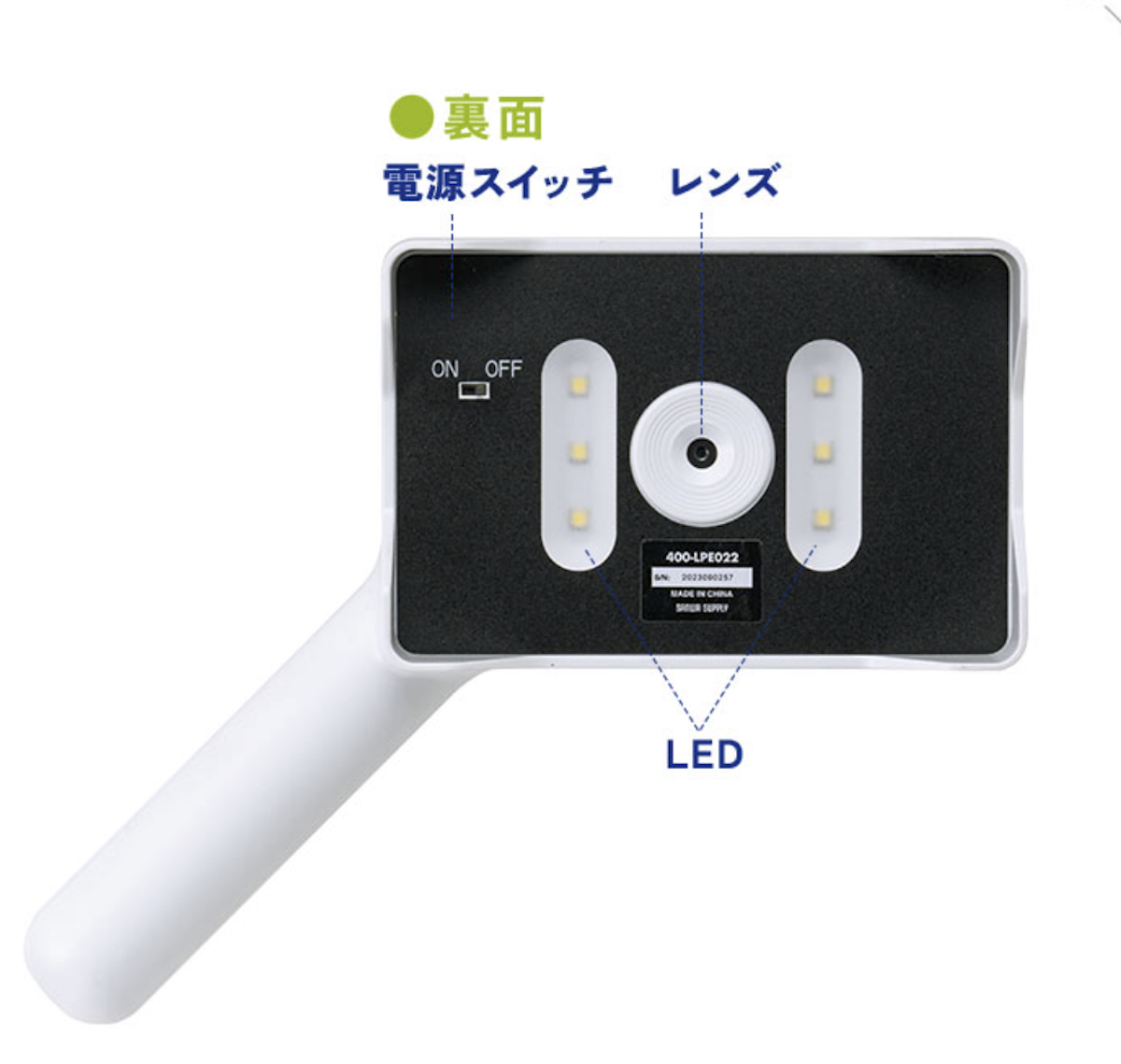 本体裏のLEDは左右に3つずつ、合計6つ搭載されており、思っている以上に明るいです。このおかげで、手や頭の影で隠れてしまうことがなく、暗い場所でも対象を明るく拡大表示できます。