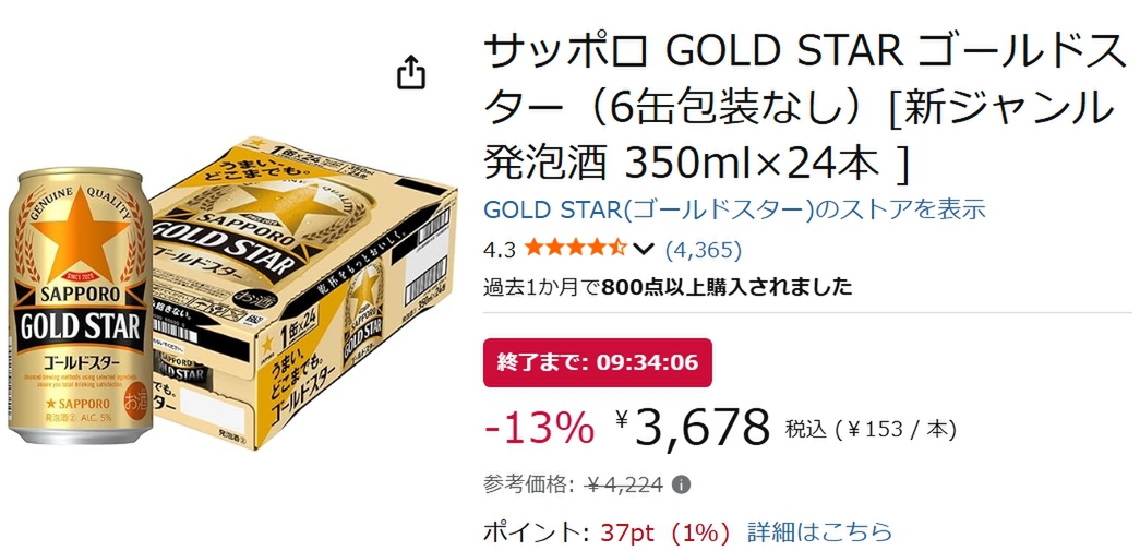 「サッポロ GOLD STAR 350ml×24本」が、Amazonタイムセールでは、1本あたり約153円まで価格が下がっています。