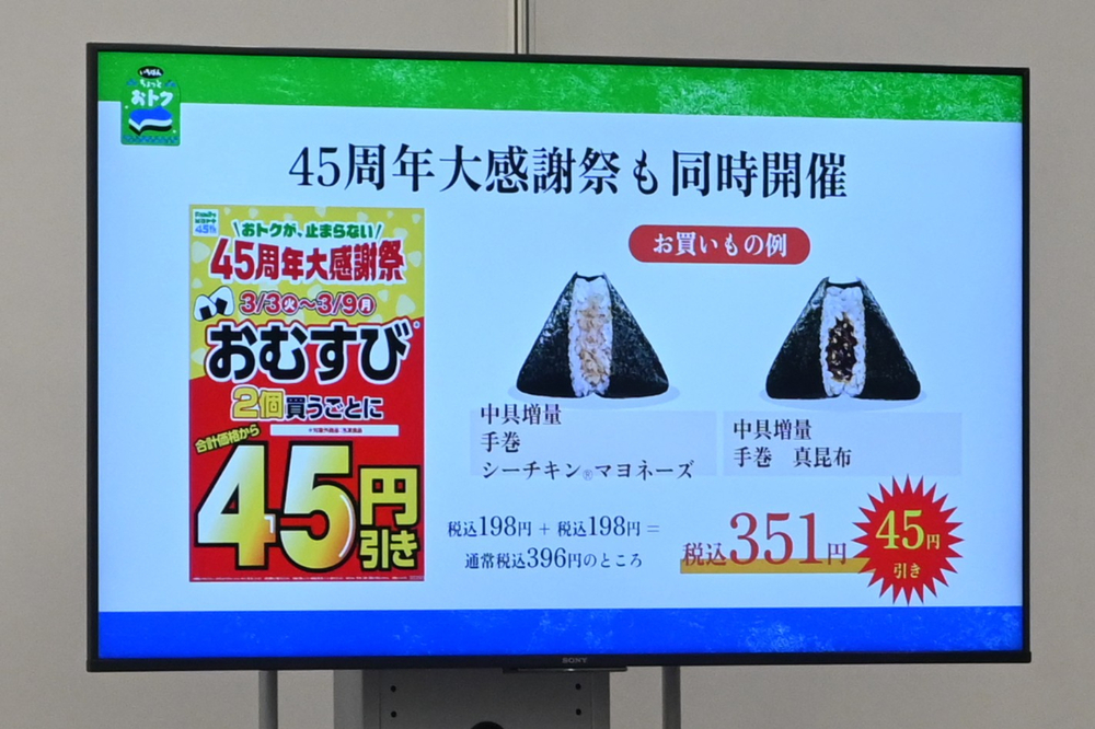 あわせて「45周年大感謝祭」の施策として、「おむすび2個購入ごとに45円引き」となるキャンペーンも実施。増量商品も対象に含まれ、2個購入してもお手頃な300円台。