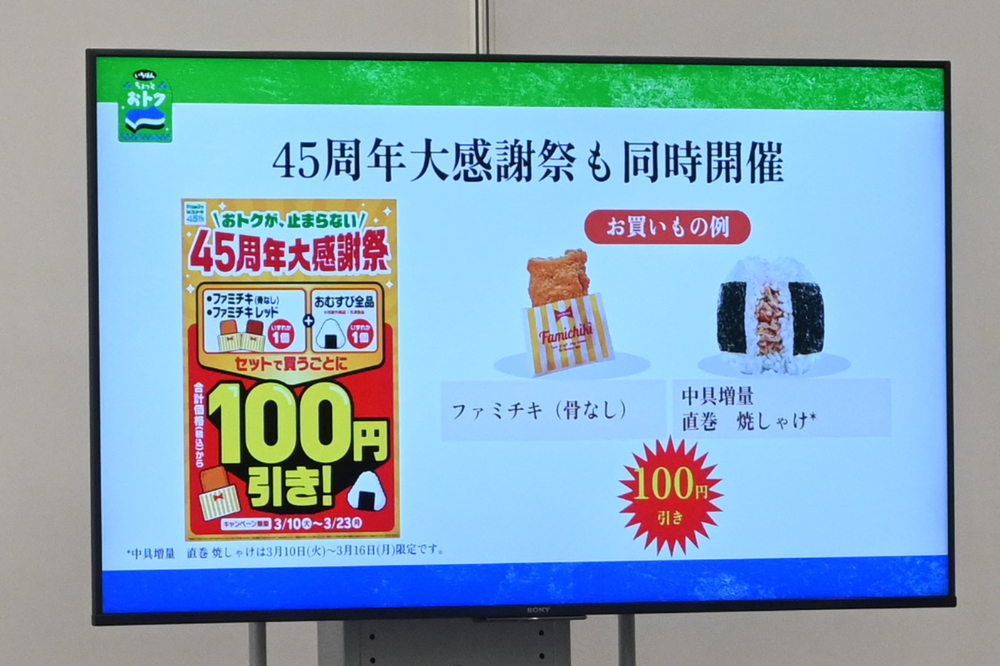 さらに3月10日からは、おむすびのと併買率1位というホットスナック「ファミチキ」と「おむすび」をセット買いすると、100円引きになるキャンペーンが始まります。