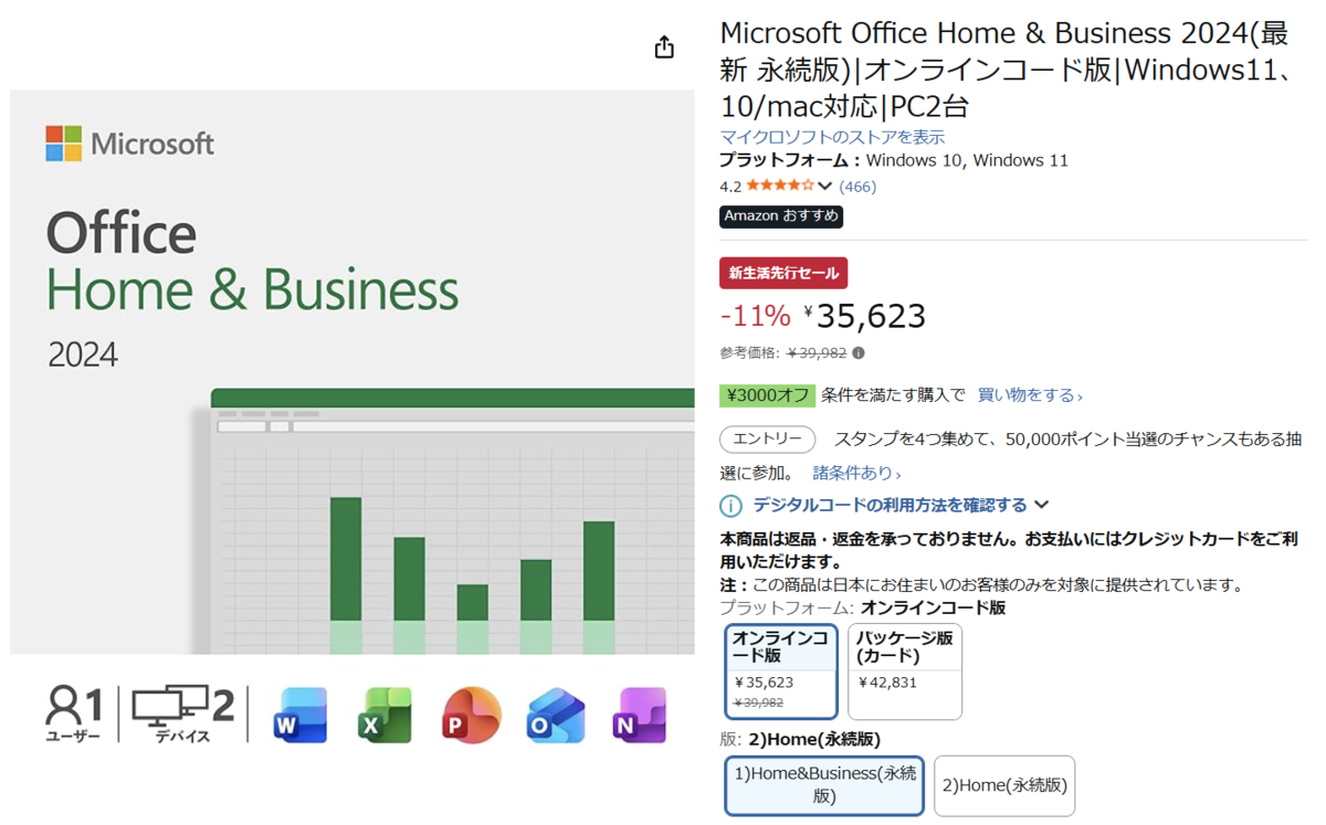 Microsoftのオフィスソフト「Microsoft Office Home & Business 2024(永続版/オンラインコード版)」が、3月3日開始のAmazon新生活先行セールの対象になっています。参考価格39,982円のところ、11%オフの35,623円で販売されています。