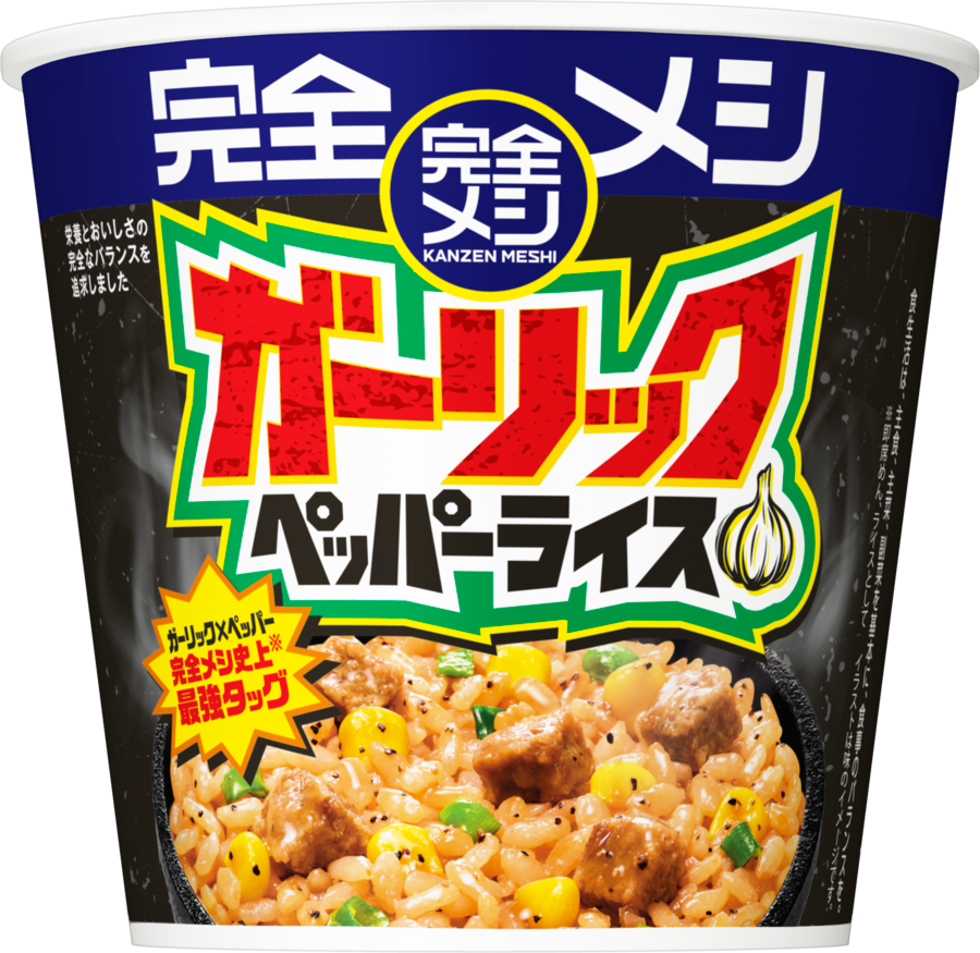 「完全メシ ガーリックペッパーライス」は、牛のうまみをベースに、ローストガーリックとブラックペッパーを強めに効かせたスパイシーな味わいを特徴としたカップメシ。熱湯を注いで5分で完成する。