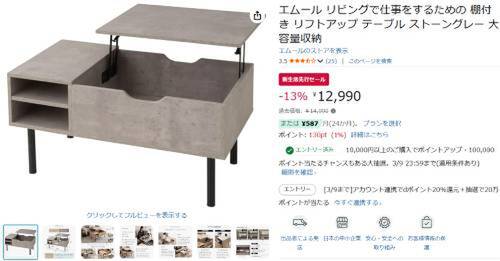 エムールの「リビングで仕事をするための棚付きリフトアップテーブル」が、Amazon新生活先行セールの対象に。過去価格14,990円のところ、13%オフの12,990円で販売中。