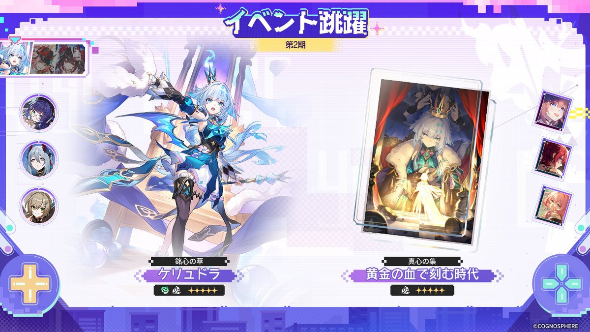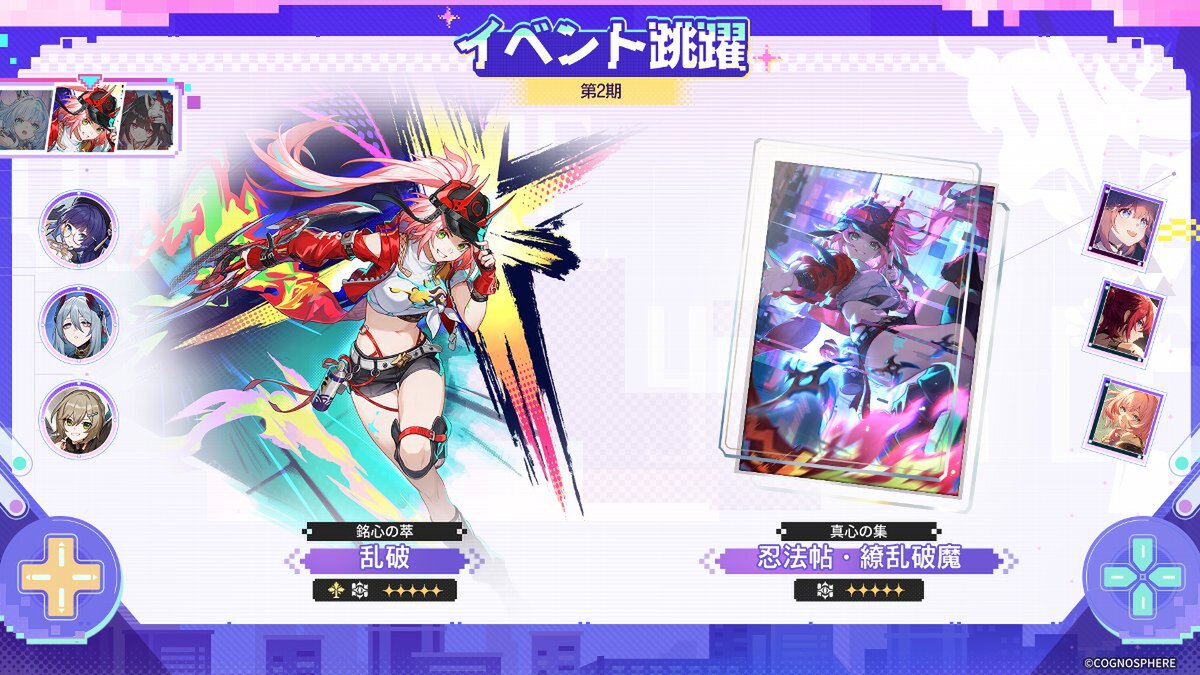 3月3日より、イベント跳躍「銘心の萃」と「真心の集」を開催。期間中「銘心の萃」にて、限定星5キャラクター「ケリュドラ」(CV:高尾奏音さん)、「乱破」(CV:潘めぐみさん)、「花火」(CV:上田麗奈さん)が再登場。また再び彼女たちを入手できるチャンスとなっているので、お見逃しなく。