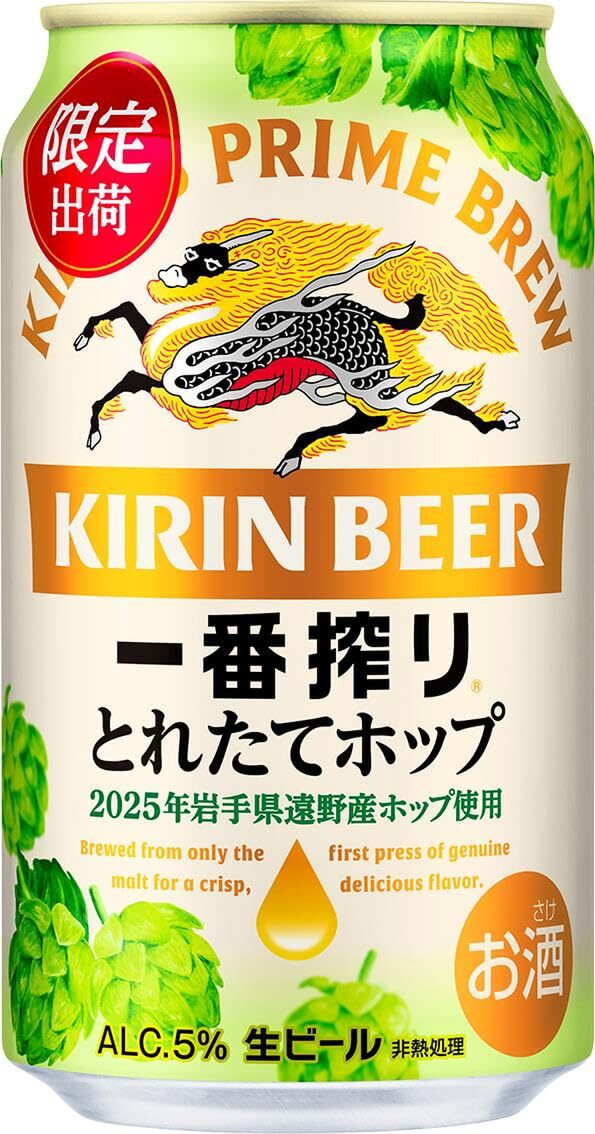 「一番搾り とれたてホップ生ビール」は、岩手県遠野市産の今年の夏に収穫したホップを急速凍結して使用し、上品な麦のうまみが感じられるというビールです。。