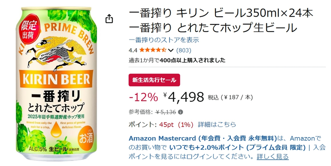 発売22年目を迎える「一番搾り とれたてホップ生ビール 350ml×24本」が、現在開催中のAmazon新生活先行セールで12%オフの4,498円となっています。1本あたり約187円で購入できる機会は限られています。