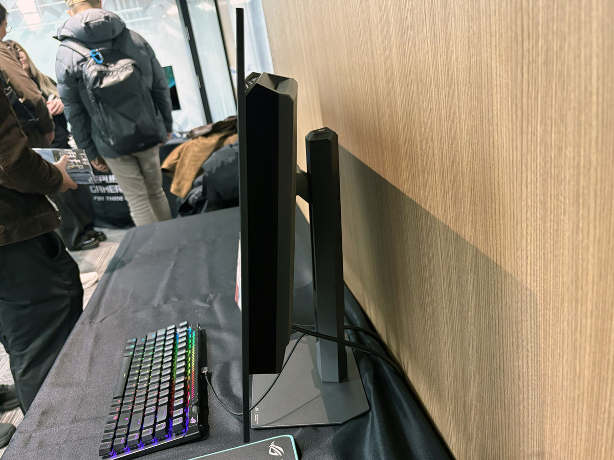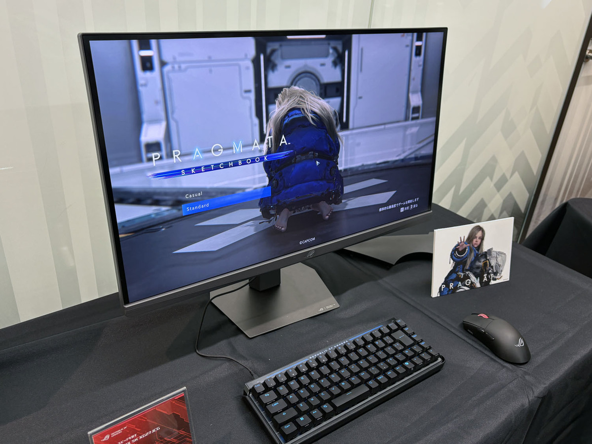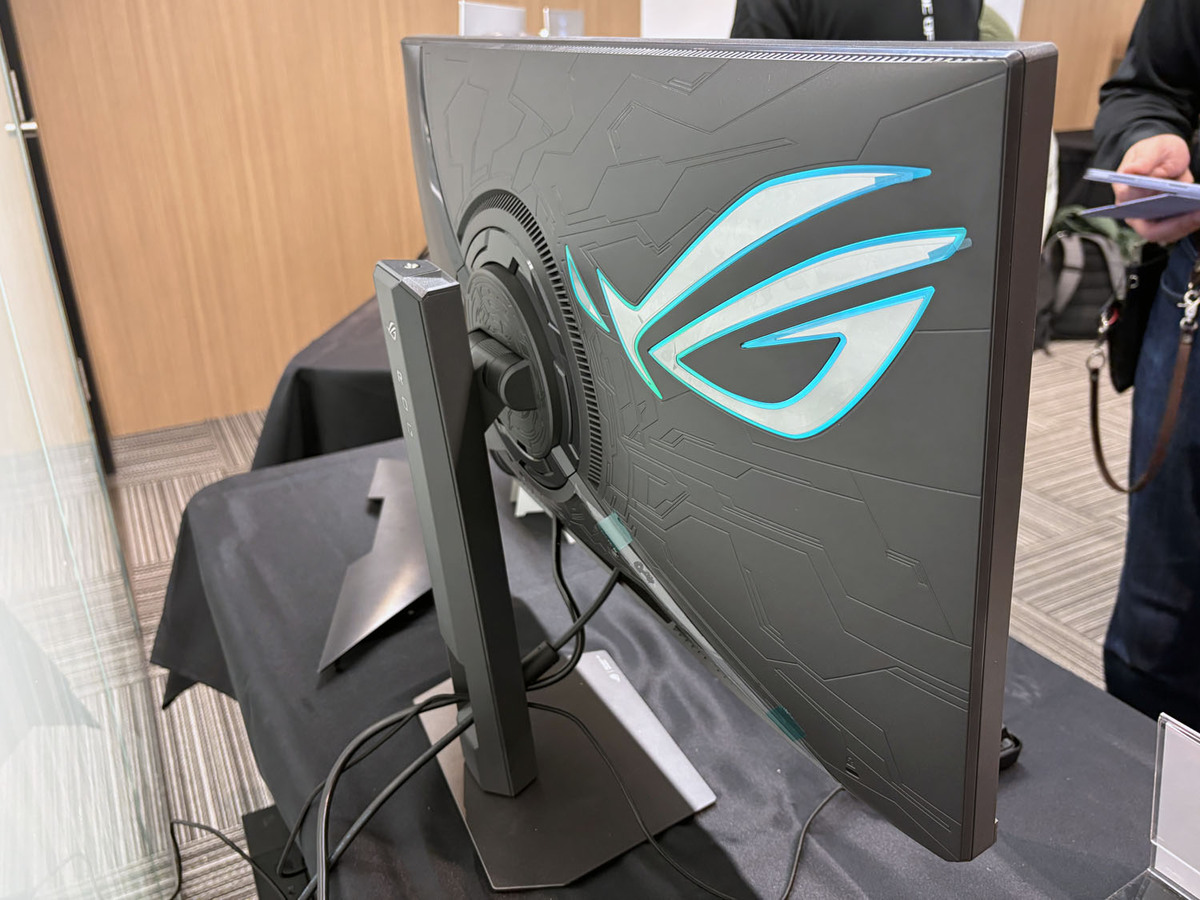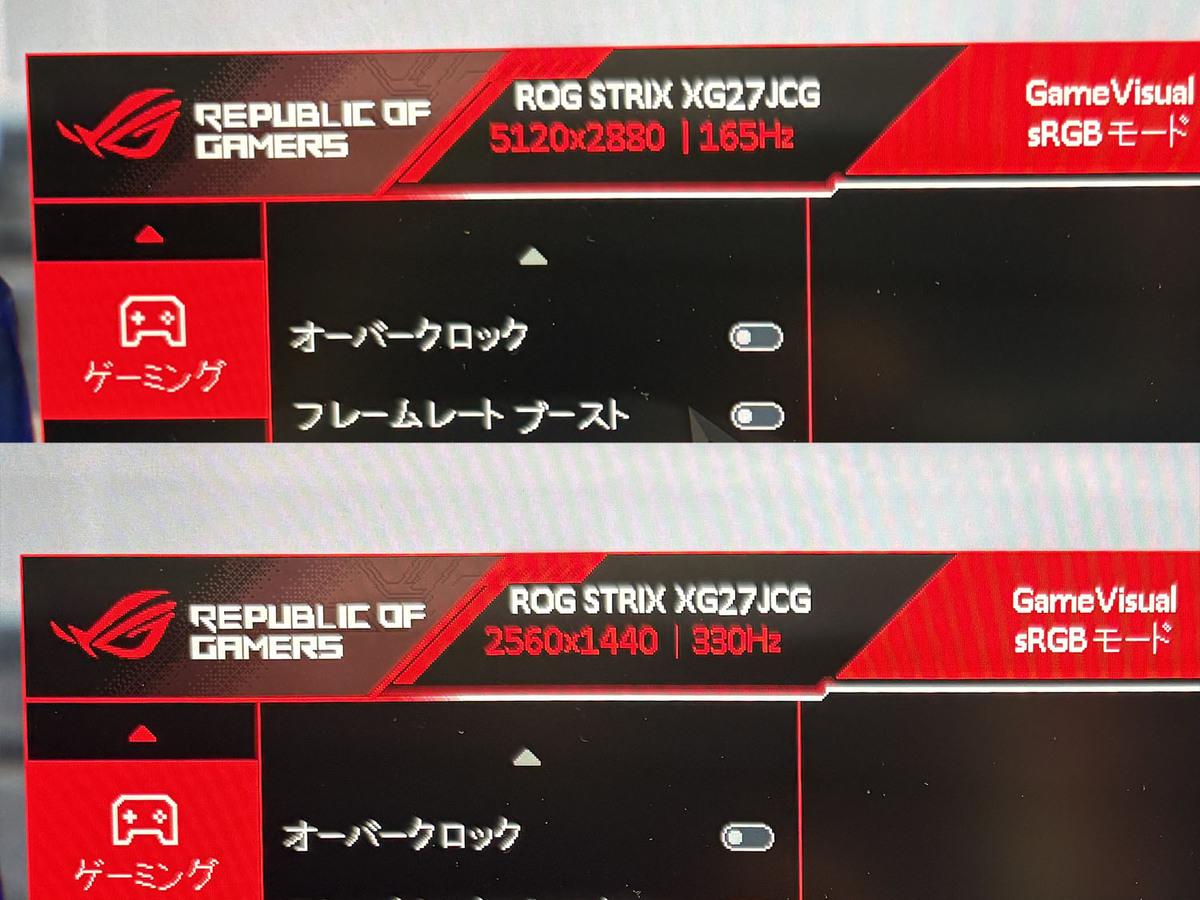 展示の目玉となったのは、27インチで5K(5120×2880)という圧倒的な高精細表示を実現した「ROG Strix 5K XG27JCG」だ。デュアルモード機能を搭載し、用途に応じて「5K/180Hz」の高精細表示と「QHD/330Hz」の高フレームレート表示を切り替えできる。Fast IPSパネルを採用し、0.3ms(GTG)の高速応答に加え、VESA DisplayHDR 600およびDCI-P3 97%の広色域に対応している。