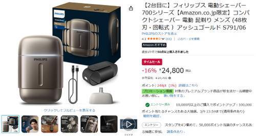 フィリップスの電動シェーバー「700シリーズ(S791/06)」がAmazonタイムセール対象。参考価格29,700円のところ、16%オフの24,800円で販売中。