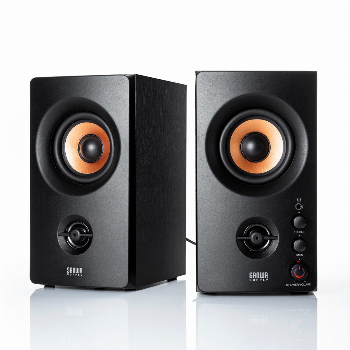 高音質が楽しめるブックシェルフスピーカー。バスレフ構造を採用し、最大出力10W×2のウーファーと5W×2のツイーターの合計最大出力は30W。さらに、前面のボタンで音質をコントロールできます。ディスプレー横に据え置いて活用したいガジェットです!