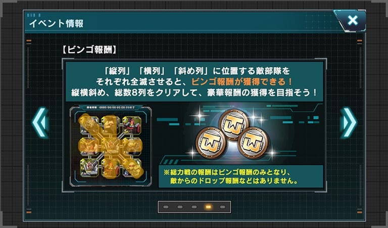 「総力戦」は縦3マス×横3マスの合計9マスにいる敵部隊を撃破していくイベント。撃破したマスでラインがそろうたびに豪華報酬を獲得できる。