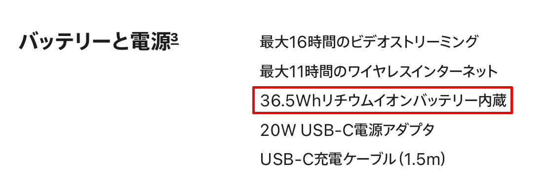最後はバッテリー。容量は36.5Whと、M5 MacBook Airの53.8Whと比べて大分少ない。スペック上の表記も後者が「リチウムポリマー」なのに対し、通常の「リチウムイオン」となっている。