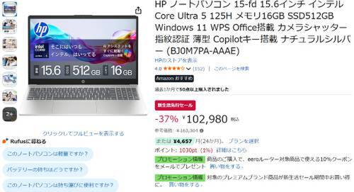 【37%オフ】Core Ultra 5 × 16GBで102,980円。HPの15.6型ノートPCなら普段使いに余裕が出る