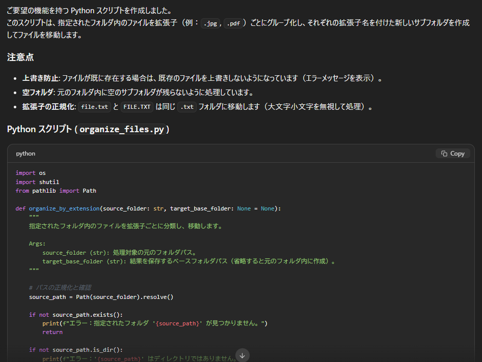 生成されたコードには、拡張子ごとの分類処理やサブフォルダの作成、上書き防止といった実用上の配慮も含まれており、そのまま動作する完成度に近い。関数単位で整理されているため構造も分かりやすく、用途に応じた改変もしやすい。ファイル操作や例外処理も含めて一通りの構成が揃っており、実務的なスクリプトとして成立している。