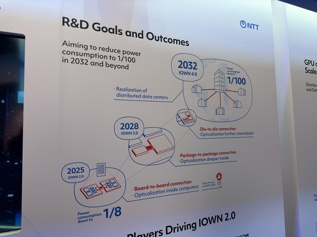 2025年には「IOWN 2.0」としてサーバーのボード間を光で接続する技術を開発し、これによって消費電力を大幅に削減できることを確認した。さらに先のロードマップとして、「IOWN 3.0」ではパッケージ間の光接続に向けた開発を進めている。