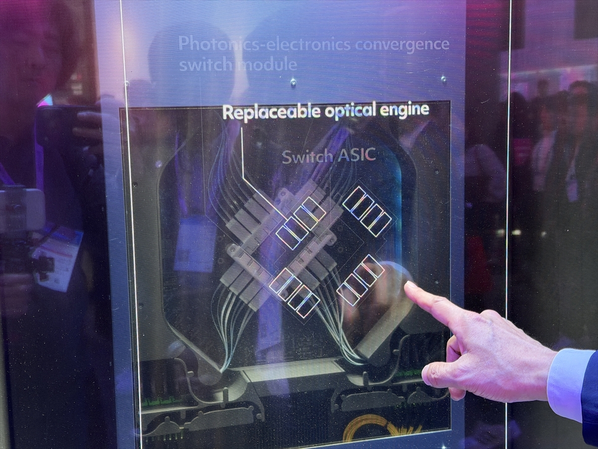 NTTのブースでは、データセンター内で使用するハードウェアとして「PECスイッチ(Photonics Electronics Convergence Switch)」を紹介。 PECスイッチは、中央にスイッチングチップを配置し、それを取り囲むようにプラガブルな光電融合デバイスが組み込まれた構成をとる。
