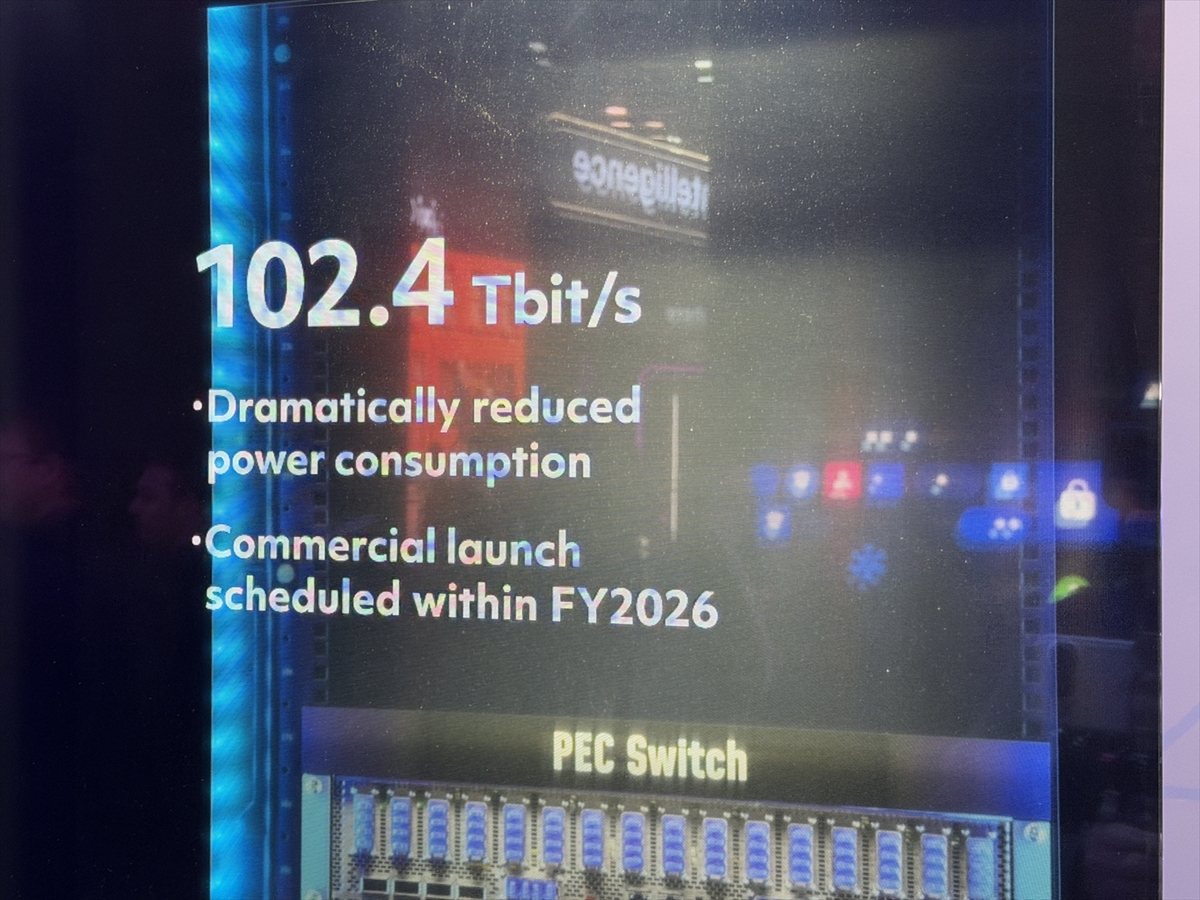 現在展示されているPECスイッチは102.4Tbpsのキャパシティを持ち、2027年早期の商用版リリースを目指している。開発にあたっては、ブロードコムなどの協業ベンダーと連携して取り組みを進めている状況である。また、電気を使用する部分が減少することは、発熱量の低下にも直結する。