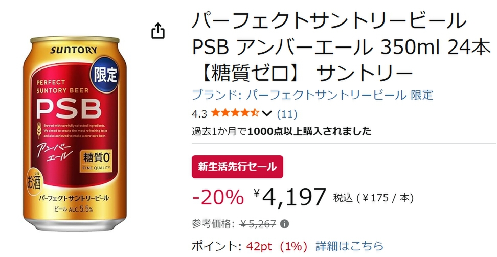 【20%オフ】糖質ゼロでも、飲みごたえにこだわる。「PSB アンバーエール」24本がAmazon新生活先行セール対象に!
