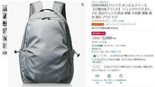KACHIKAのリュック「SOLA」がAmazon新生活先行セール対象。過去価格4,980円のところ、20%オフの3,980円で販売中。