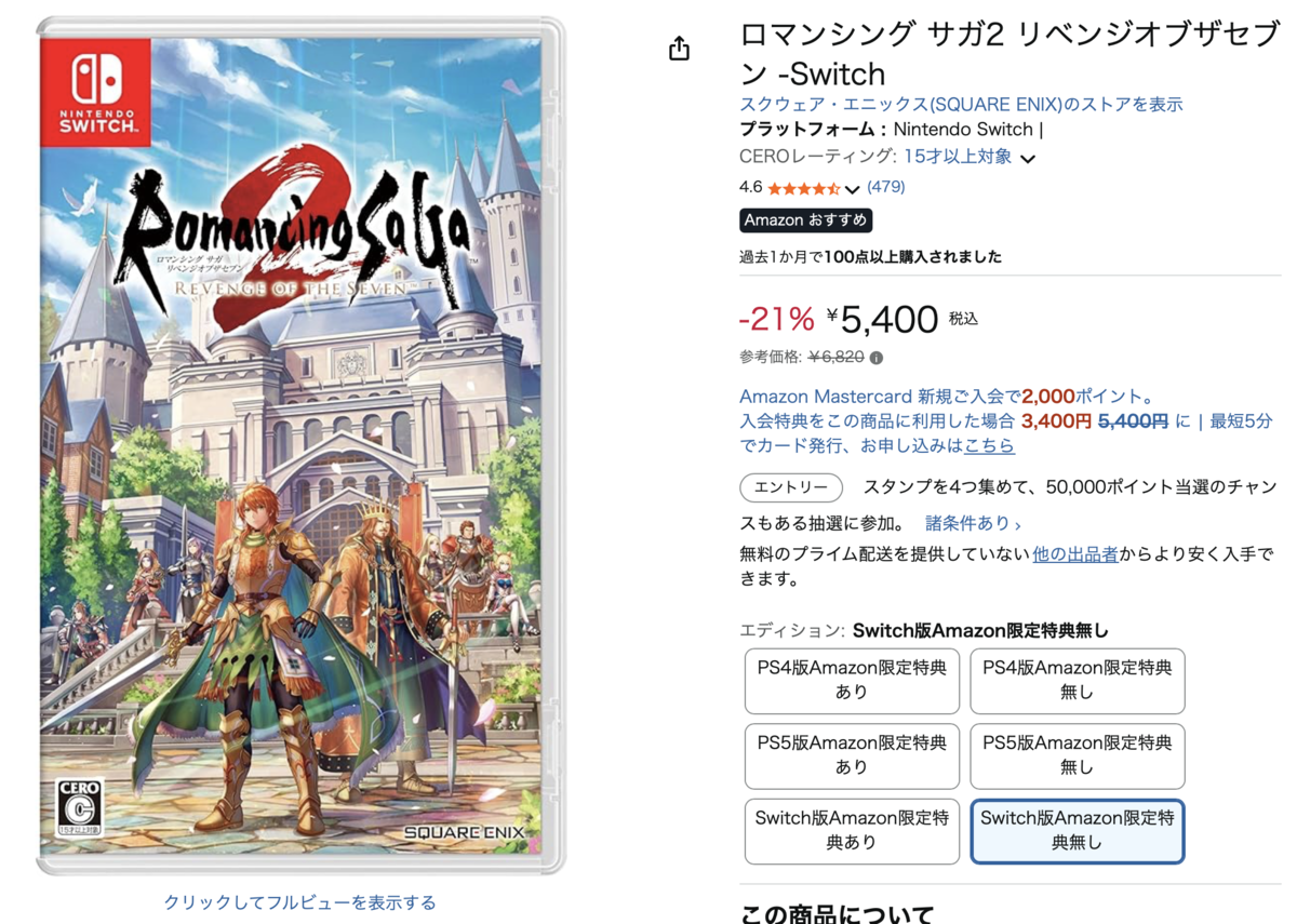 そこで紹介するのは、「ロマンシング サガ2 リベンジオブザセブン -Switch」です。参考価格は6,820円ですが、Amazonでは21%オフの5,400円で購入できます。