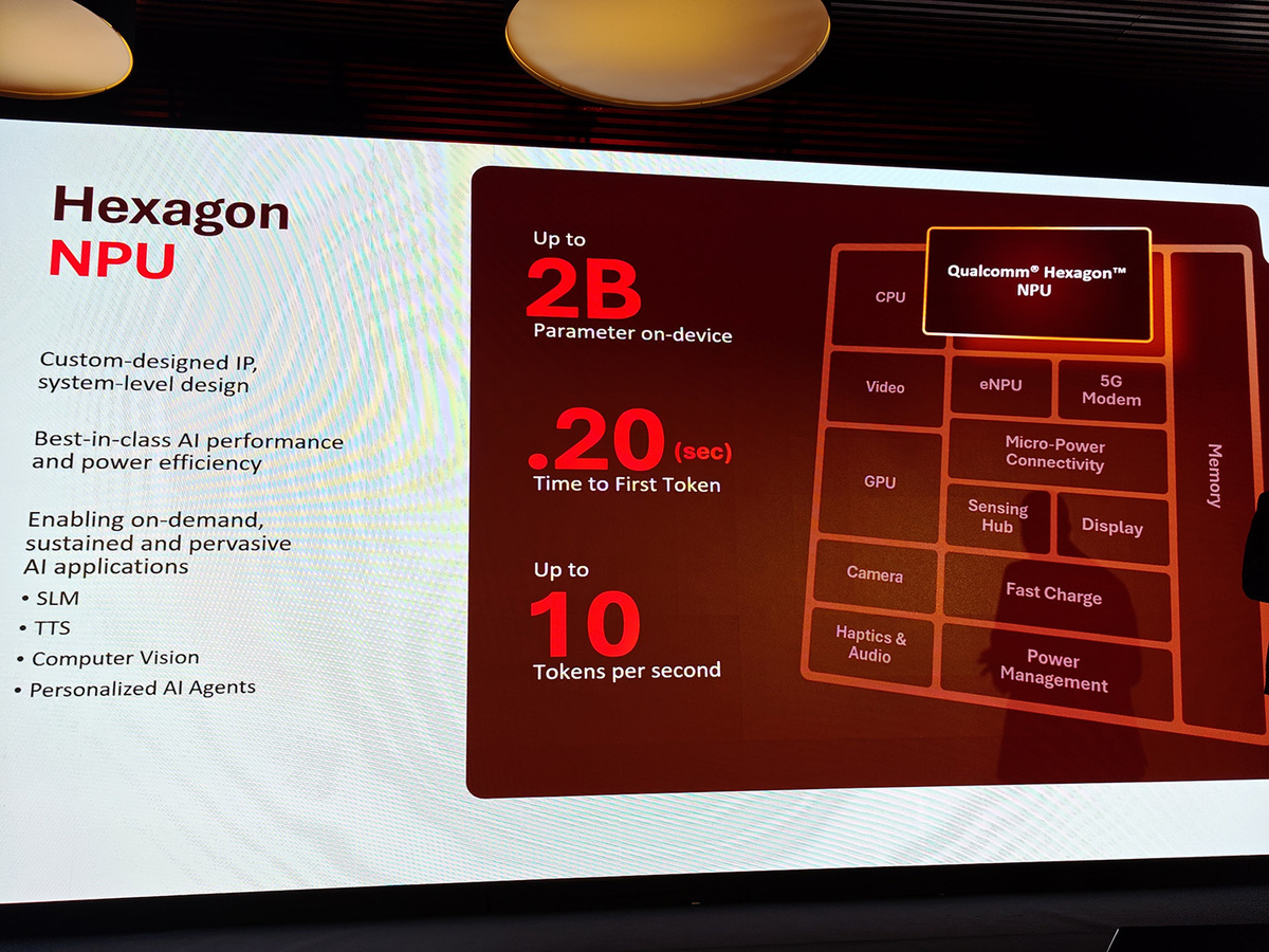 GPUは次世代のAdreno GPUを搭載し低電圧ながらグラフィックス性能が7倍に向上。リッチなビジュアルや滑らかなアニメーション、高度な常時表示ディスプレイをバッテリーを犠牲にすることなく実現する。NPUはスマートフォン向けに実績のあるNPU技術をウェアラブル向けにスケールダウンしたHexagon NPUを初搭載。最大20億パラメータのAIモデルをオンデバイスで実行可能にし、クラウドに頼ることなくリアルタイムの知能を提供する。