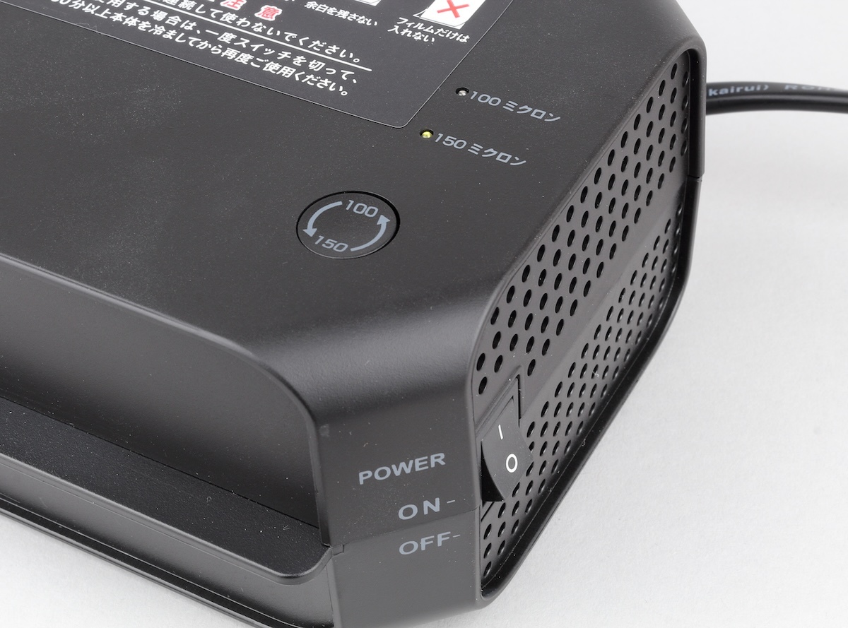ラミネートフィルムの厚みは、100ミクロンと150ミクロンの2種類に対応。起動後でも、厚み選択ボタンを押せば切り替え可能です。なお、加熱などの都合から、切り替えには数十秒かかることがありました。準備が整い使えるようになればアラームで教えてくれるので、切り替わる前に使ってしまうといった失敗はないでしょう。