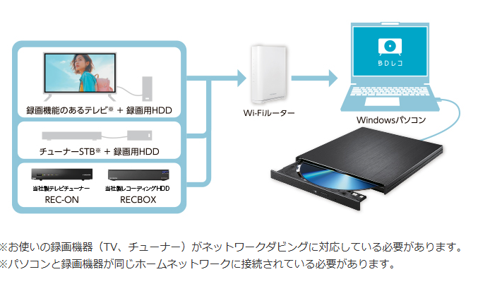 BDレコは、は、テレビの外付けHDDに録画した番組をネットワーク経由でパソコンに転送し、そのままBlu-ray Discにダビングできる製品です(パソコンには番組は保存されず、直接BDドライブで焼く仕組みです)。