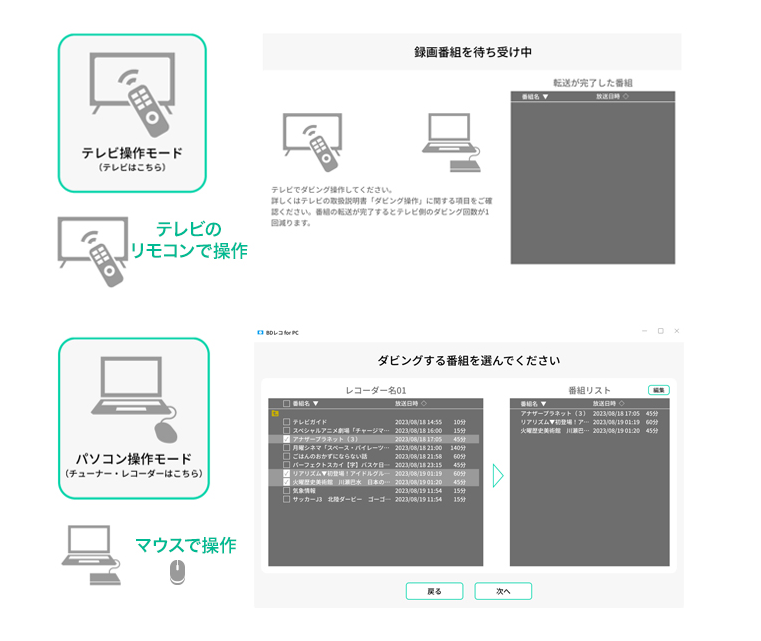 まず、番組の取得方法として「テレビ操作モード」と「パソコン操作モード」の2種類があります。テレビ操作モードではテレビ内の録画番組を直接ダビングでき、パソコン操作モードではチューナーやレコーダー内の録画番組をPC側から操作して取り込むことができます。