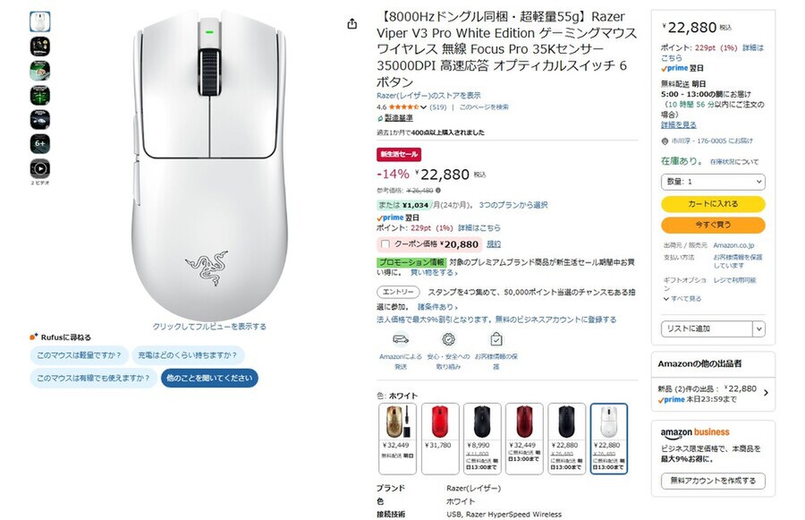 Amazon.co.jpにて、ゲーミングマウス「Razer Viper V3 Pro White Edition」が販売中だ。参考価格は2万6480円だが、新生活セールにより14%オフの2万2800円で購入できる(3月6日時点)。
