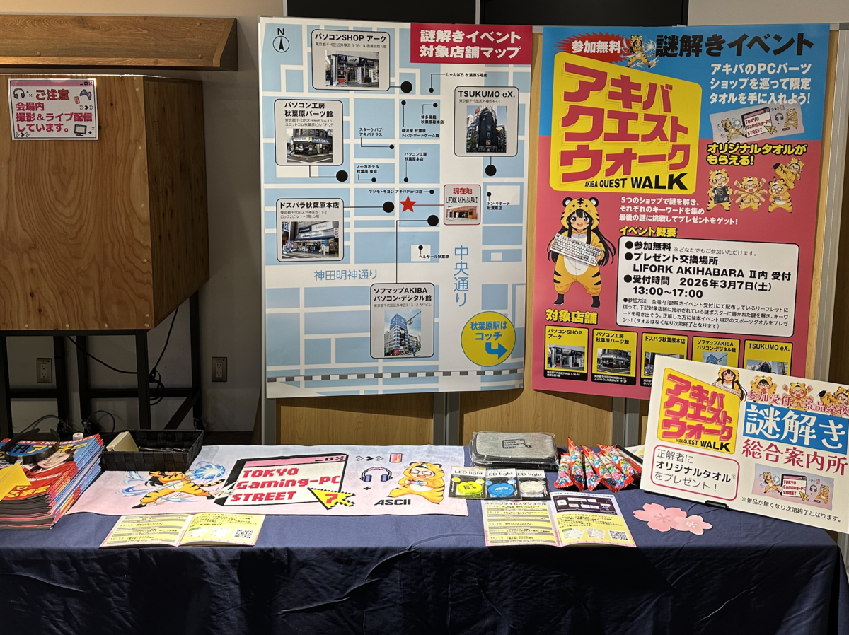2025年12月に開催したイベント「TOKYO Gaming-PC STREET 6」でも大好評だった、親子連れでも参加いただける、秋葉原のパーツショップを巡りながらキーワードを集める謎解きイベント「謎解き アキバクエストウォーク」を実施します。
