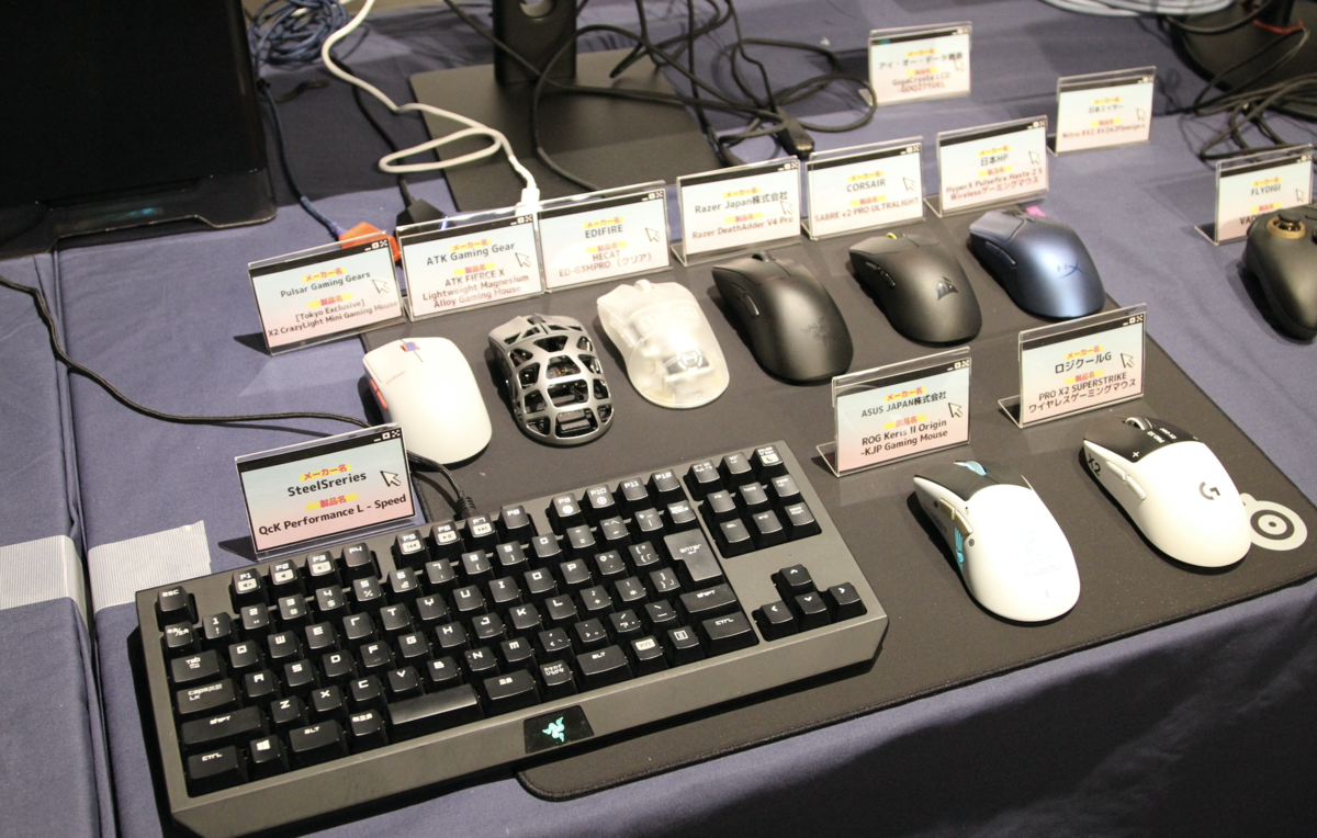 今回も、パートナー協賛/協賛のメーカーによる展示ブースと、編集部によるブースを設けました。編集部によるブースは「推しゲーミングデバイス大集合スペシャル」と銘打ち、キーボード、マウス、コントローラー、ヘッドセットをずらりと並べました。