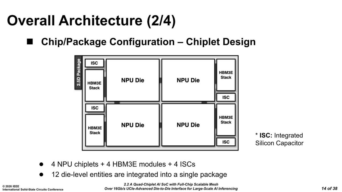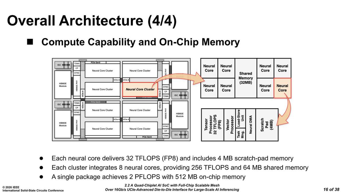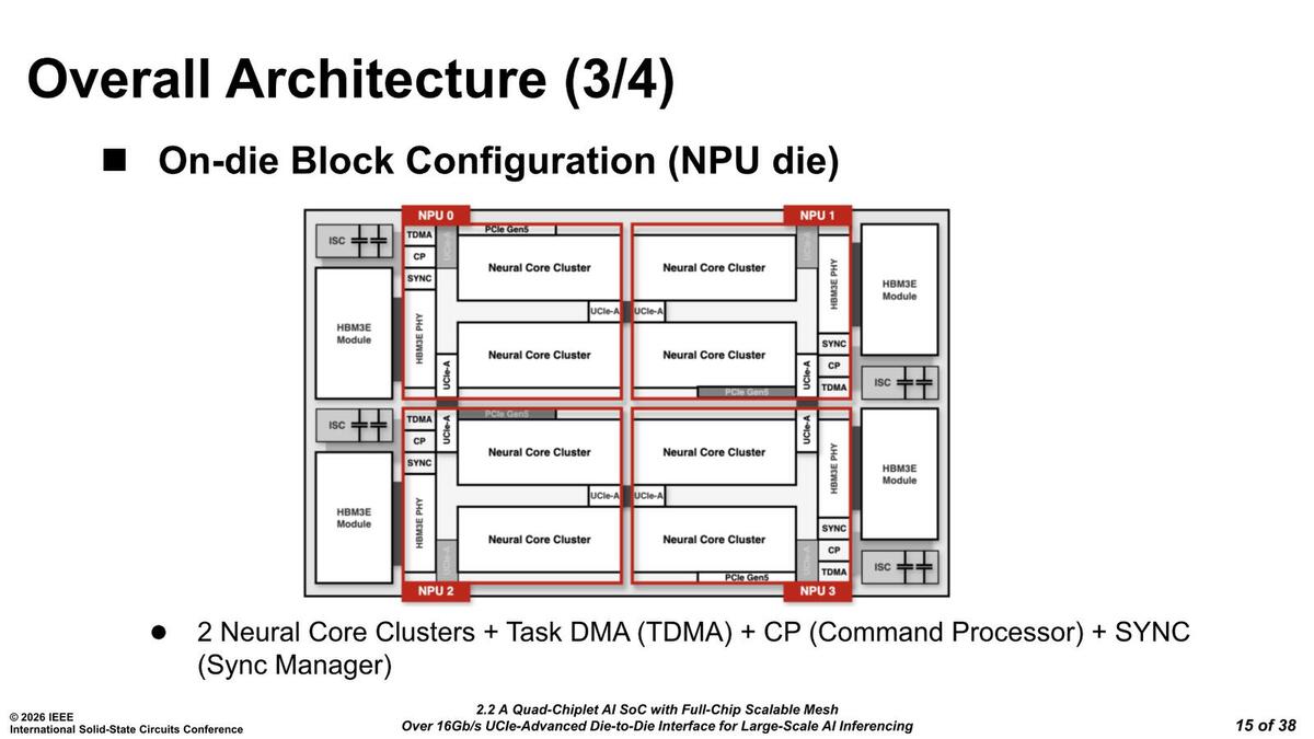 内部にはニューラルコア×16と共有メモリー×8ブロック、UCIe-A(Advanced Package)のI/Fが3ヵ所と2×PCIe Gen5 x16のI/F、HBM3eのI/F、それにTDMA(Task DMA)/CP(Command Processor)/SYNC(Sync Manager)が搭載される格好である。