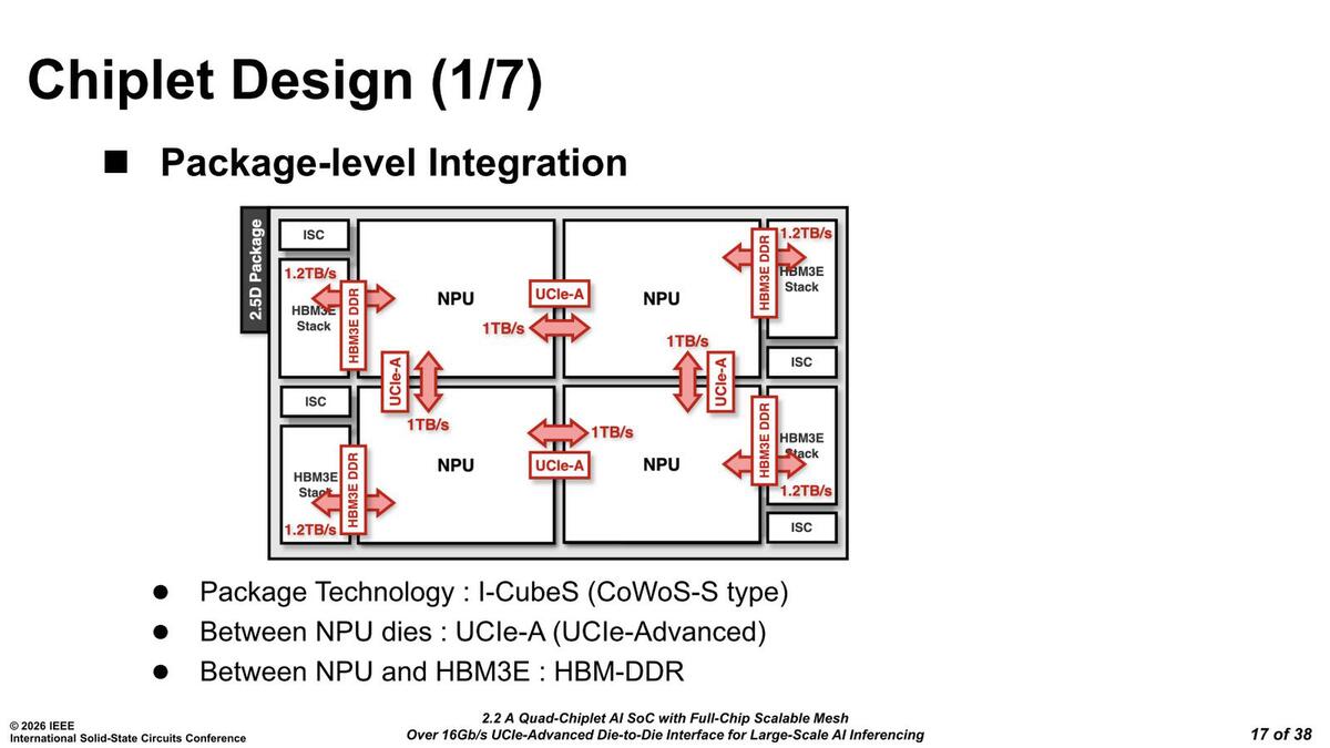 次にチップレットレベルの話。UCIe-A I/Fはいずれも1TB/秒の帯域を持つ。信号速度が32GT/秒と仮定すると256本ほどの配線になる計算だ。UCIeのアドバンスド・パッケージはx64で1つの塊なので、これを4組搭載する構成と考えられる。