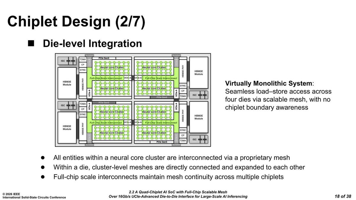 load-storeは4つのチップレットどこに対してもシームレスに行なえるとは書いてあるが、Load/Storeユニットが直接別のニューラルコアのスクラッチパッドにアクセスできるかどうかはまた別の話である。それが同一ダイ内か、別ダイかは問わない