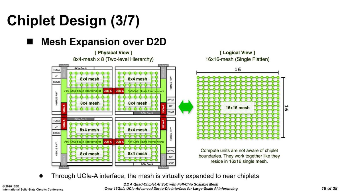 話をメッシュに戻すと、クラスターあたりでは8×4、チップレットあたりでは8×8のメッシュになるわけだが、仮想的には4つのチップレット全体をまとめた16×16のメッシュとして動作できるとする。というかプログラミングは、1つの16×16メッシュとして扱う形になっているようだ。