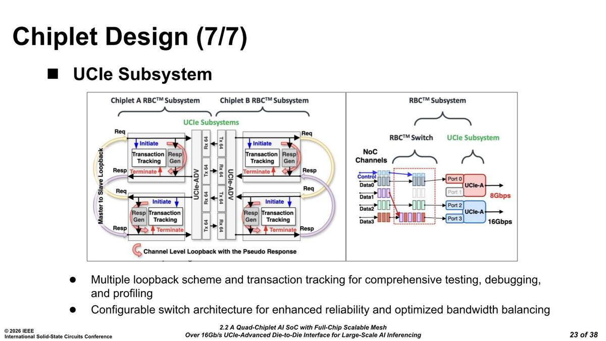 RBCは説明がどこにもない(論文の方にすらない)のだが、おそらくはRedundant Bump Circuitの略だろう。右側の動作を可能にするために、メッシュとUCIeの間にわざわざRBCスイッチを入れているわけだ