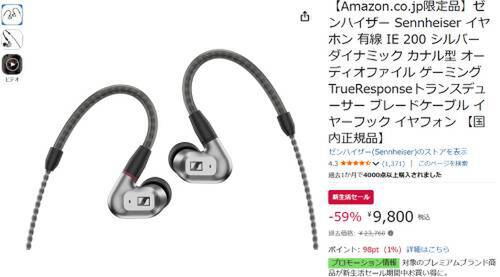 ゼンハイザーの有線イヤホン「IE 200」がAmazon新生活セール対象。参考価格23,760円のところ、59%オフの9,800円で販売中。