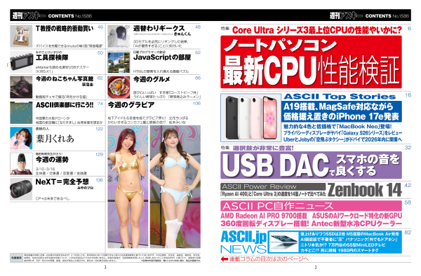 特集1ではCore Ultra シリーズ3をはじめとした最新CPUの性能比較と搭載ノートパソコンを紹介する。特集2はスマートフォンの音を手軽によくできるUSB DACだ。