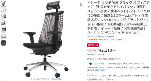 イトーキのメッシュチェア「サリダYL9」がAmazon新生活セール対象。参考価格54,900円のところ、23%オフの42,210円で販売中。