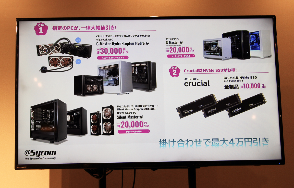 一律で最大3万円値引きする、お得なキャンペーン情報の紹介もありました。最近、半導体高騰の影響によってゆるやかな上昇傾向にあるPCの価格ですが、こうしたキャンペーンを活用しながらだと、思いのほかお得に手に入れることができそうです。