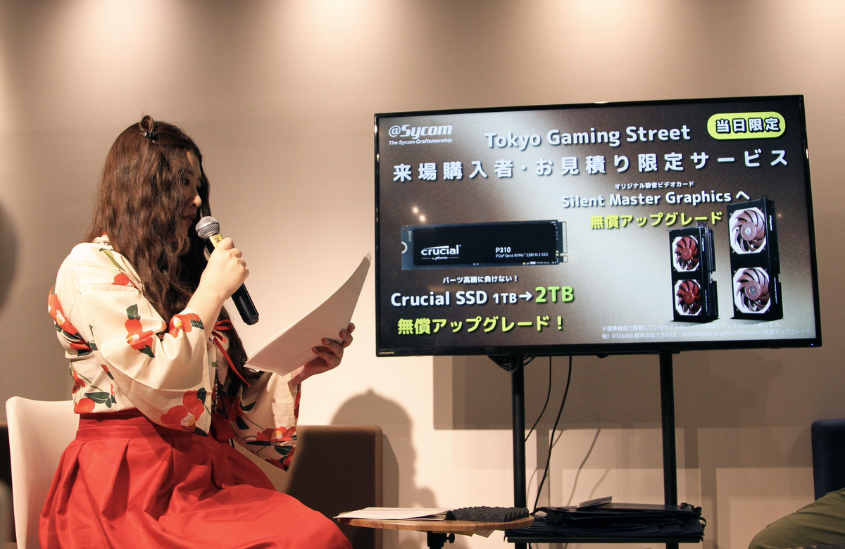 そして、TOKYO Gaming-PC STREET 7来場者限定の特典として、無償アップグレードサービスも用意してくれました! なんとサイコムブースで購入相談の上、見積/購入をした方には、SSDを1TBから2TBに無償でアップグレード。さらに、対象モデルにおいては、ビデオカードがサイコムオリジナルの静音ビデオカード「Silent Master Graphics」にも無償アップグレード!