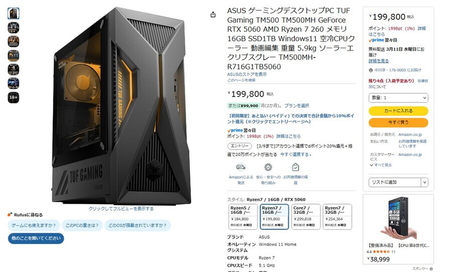 RTX 5060搭載のASUS製ゲーミングデスクトップが20万円未満
