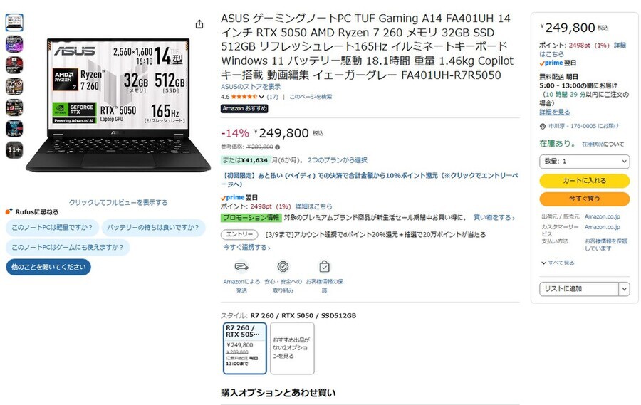 Amazon.co.jpにて、ASUSのゲーミングノートPC「TUF Gaming A14 FA401UH」が販売中だ。参考価格は28万9800円だが、執筆時点では14%オフの24万9800円で購入できる(3月9日時点)。