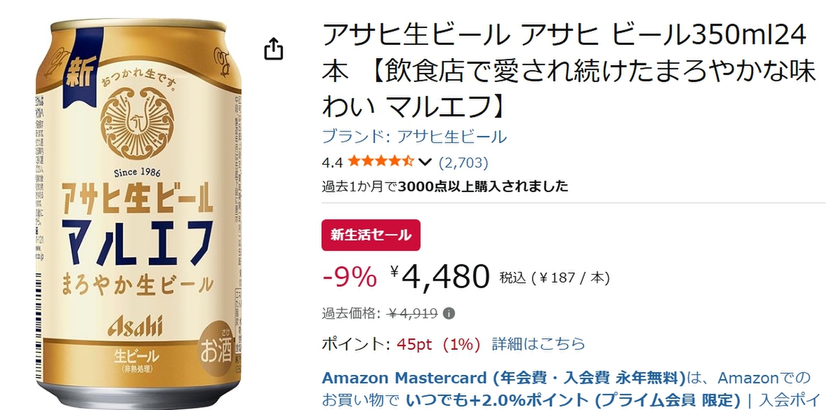 「アサヒ生ビール マルエフ 350ml 24本」が、現在開催中のAmazon新生活セールで9%オフの4,480円となっています。