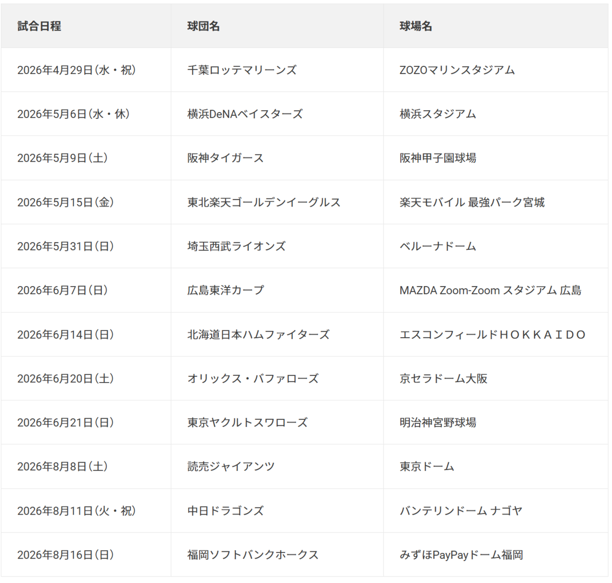 試合日程は以下の通り。4月29日の千葉ロッテマリーンズ(ZOZOマリンスタジアム)を皮切りに、8月16日の福岡ソフトバンクホークス(みずほPayPayドーム福岡)まで開催される。