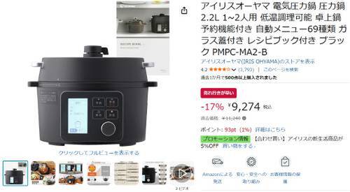 アイリスオーヤマの電気圧力鍋「PMPC-MA2-B」がAmazonタイムセール対象。過去価格11,240円のところ、17%オフの9,274円で販売中。