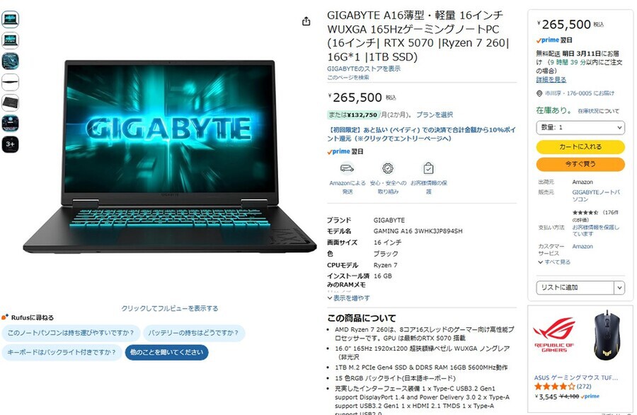 Ryzen 7&RTX 5070、165Hz液晶も魅力のGIGABYTE製16型ゲーミングノートPC、26万5500円で販売中