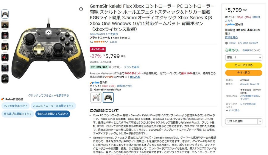 Amazon.co.jpにて、GameSirのXbox・PCコントローラー「GameSir kaleid Flux」が販売中だ。過去価格は7990円だが、タイムセールにより27%オフの5799円で購入できる(3月10日時点)。