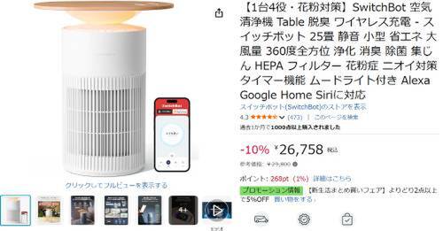 SwitchBotの空気清浄機「空気清浄機Table」がAmazonで割引中。参考価格29,800円のところ、10%オフの26,758円で販売中。