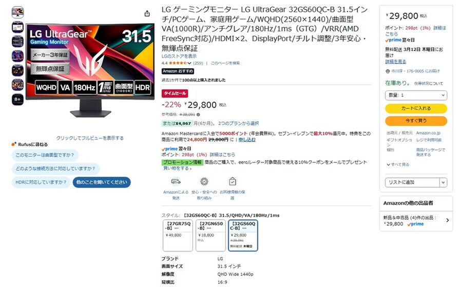 Amazon.co.jpにて、LGの31.5型ゲーミングディスプレー「LG UltraGear 32GS60QC-B」が販売中だ。参考価格は3万8091円だが、タイムセールにより22%オフの2万9800円で購入できる(3月10日時点)。