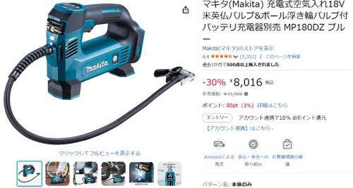 マキタの「充電式空気入れ(MP180DZ)」がAmazonで割引対象。参考価格11,500円のところ、30%オフの8,016円で販売中。